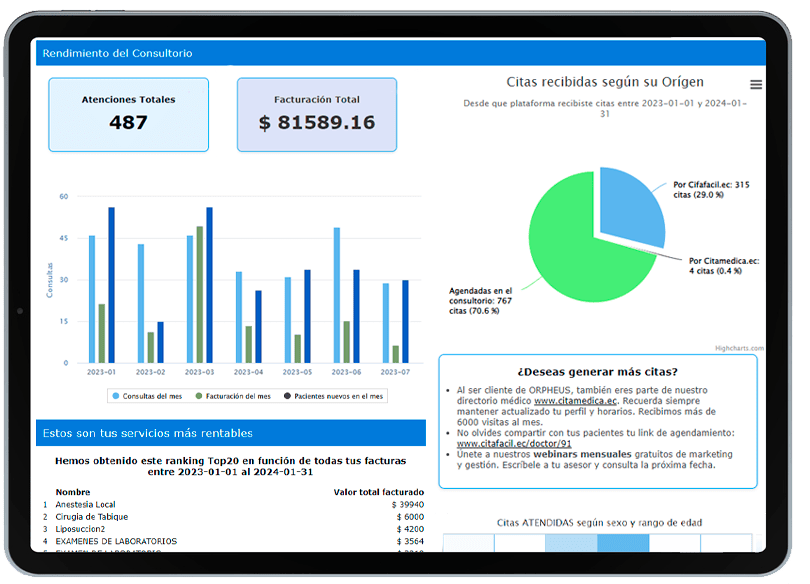 Diseñado para darte una visión general y estratégica de tu negocio. podrás acceder a estadísticas y gráficos interactivos para ayudarte a identificar oportunidades de mejora y tomar desiciones para alcanzar el éxito en tu práctica médica.
